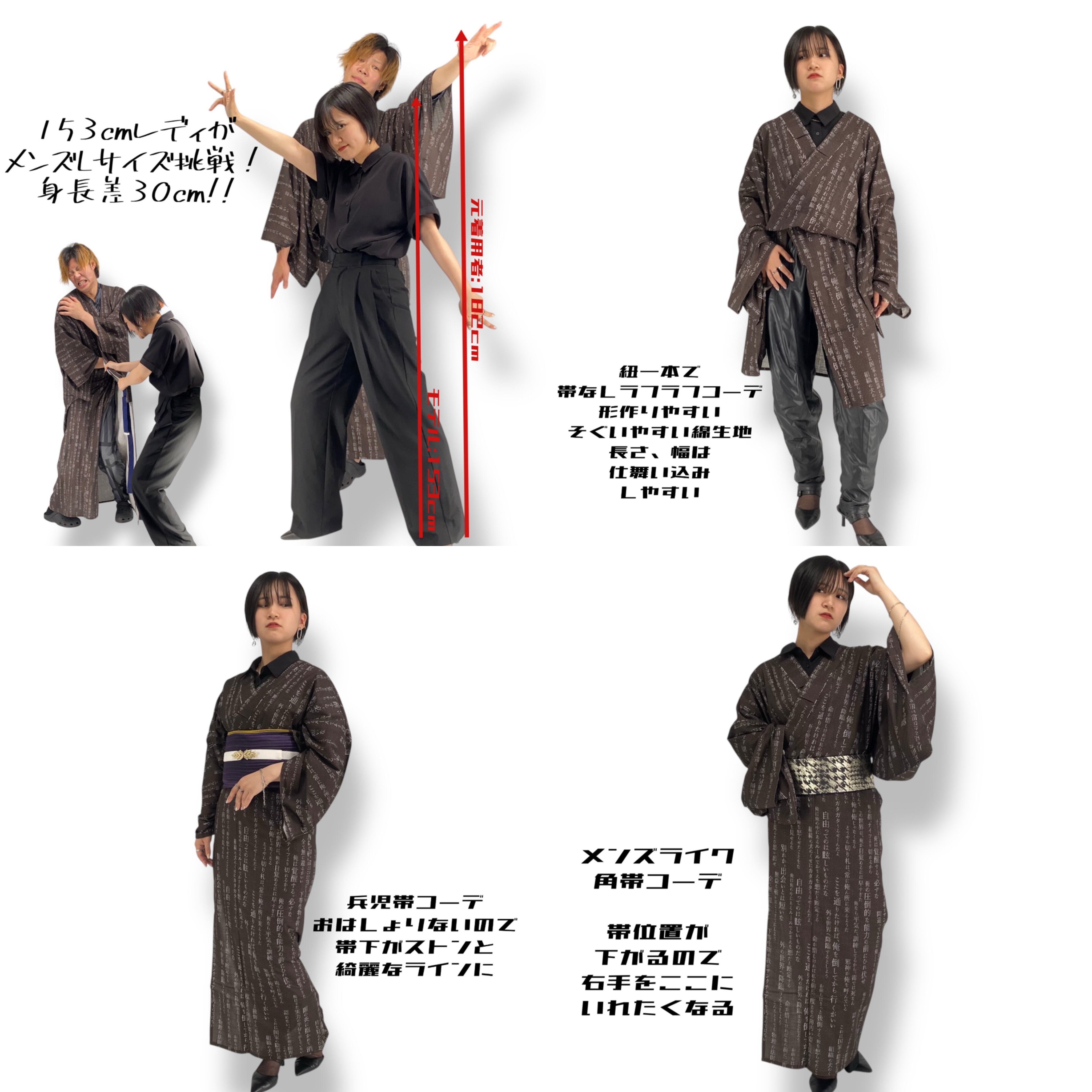 着丈が長い場合は帯下に織り込んで着用ください。着丈が短い場合はブーツ等で調整してください。