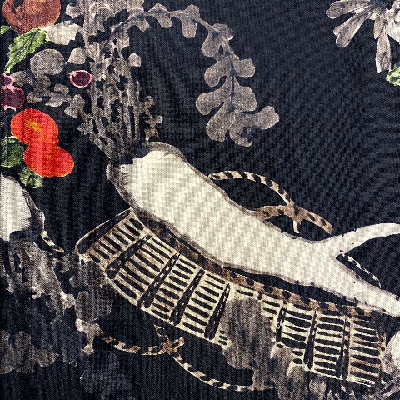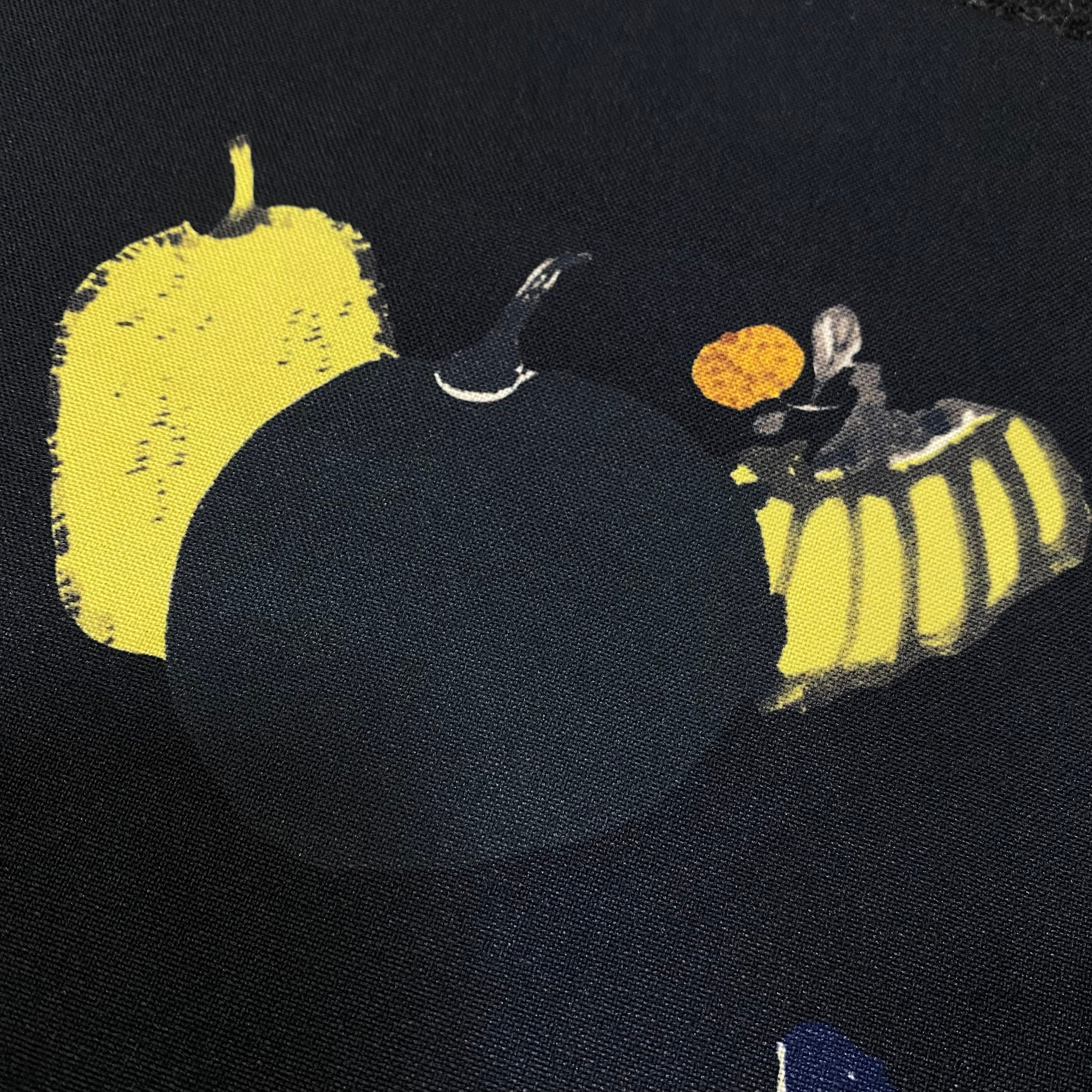軽くしっとりやわらかな着心地のポリエステル100%シャンブレー生地に伊藤若冲が残した果蔬涅槃図をバランスよくキュートに配置しました。