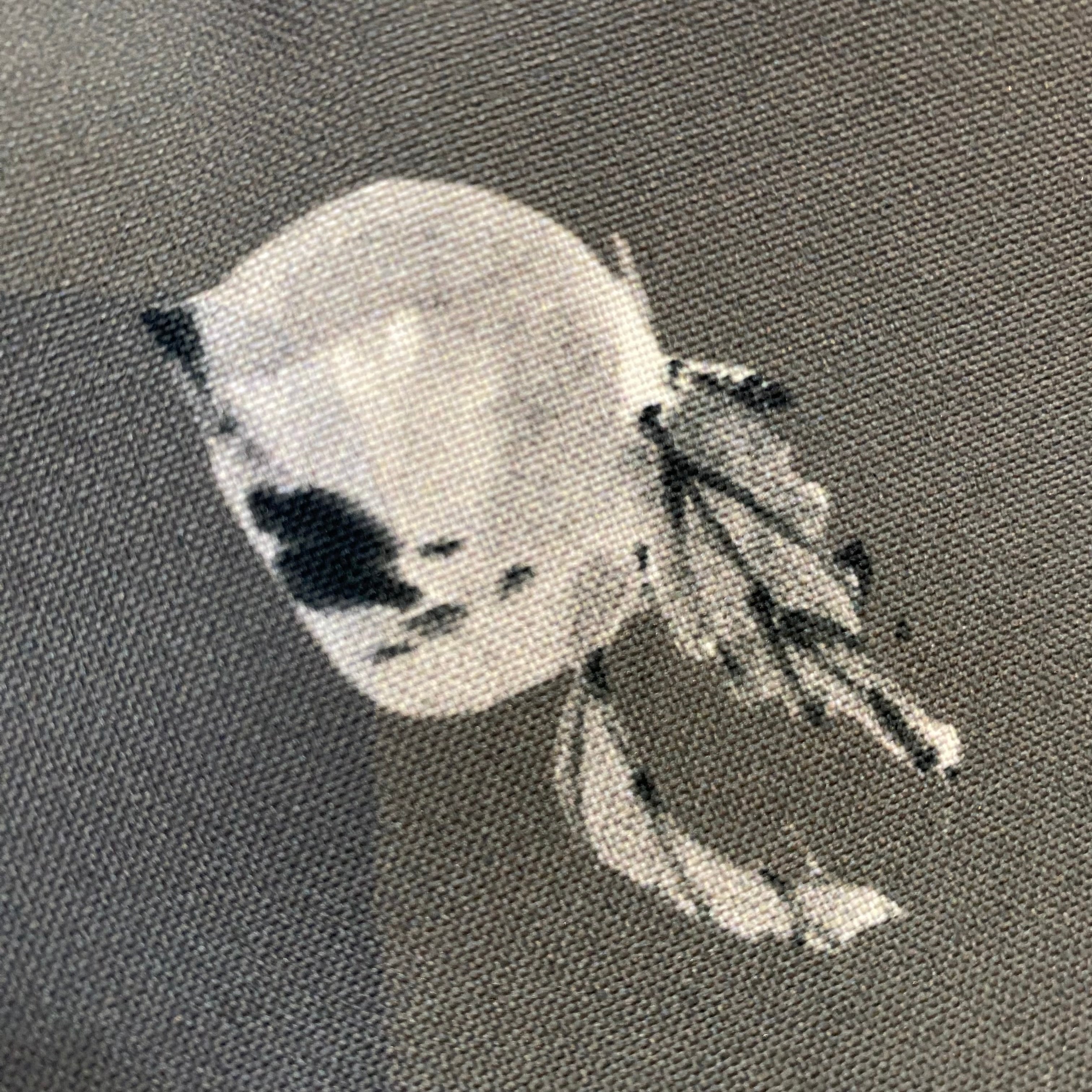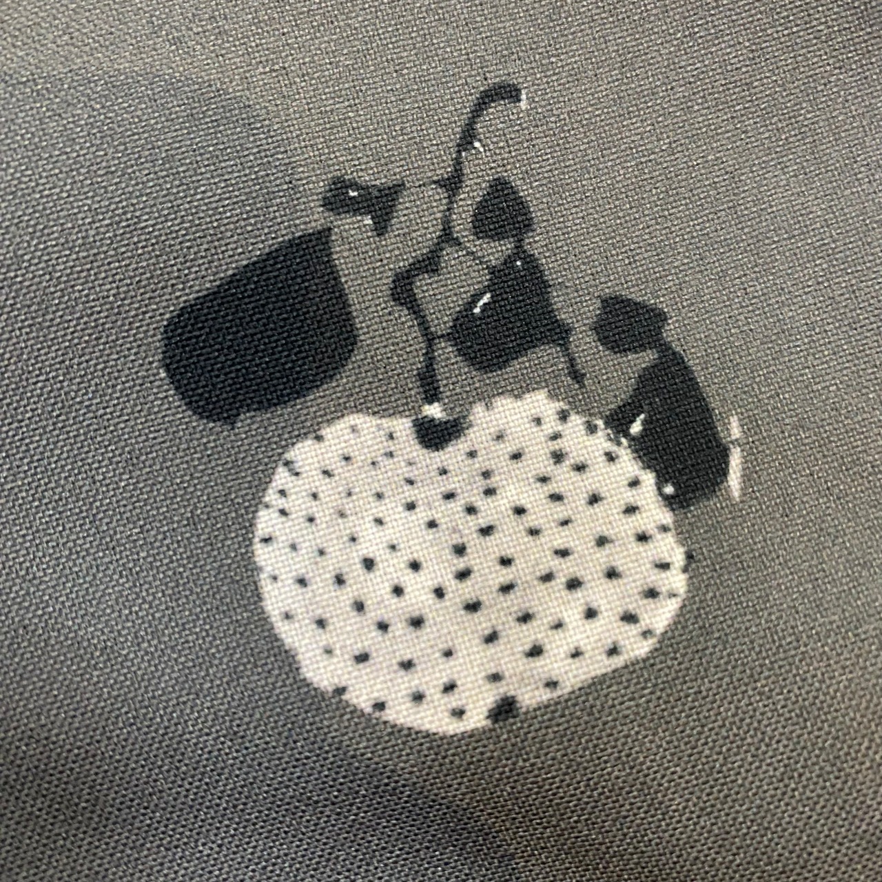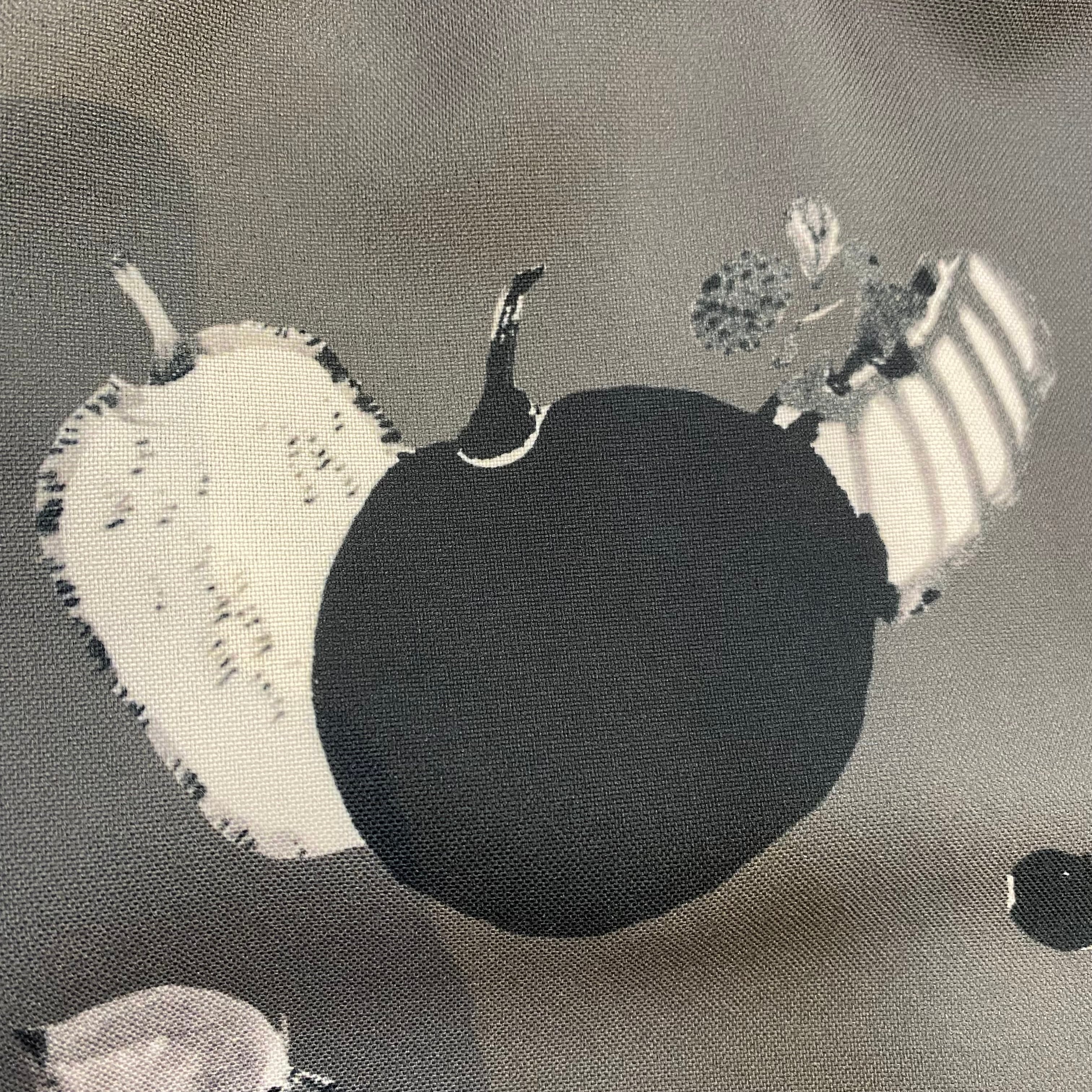 原画に近い墨描きの渋みをグレー地に。白く抜ける野菜たちが芸術的な配色です。