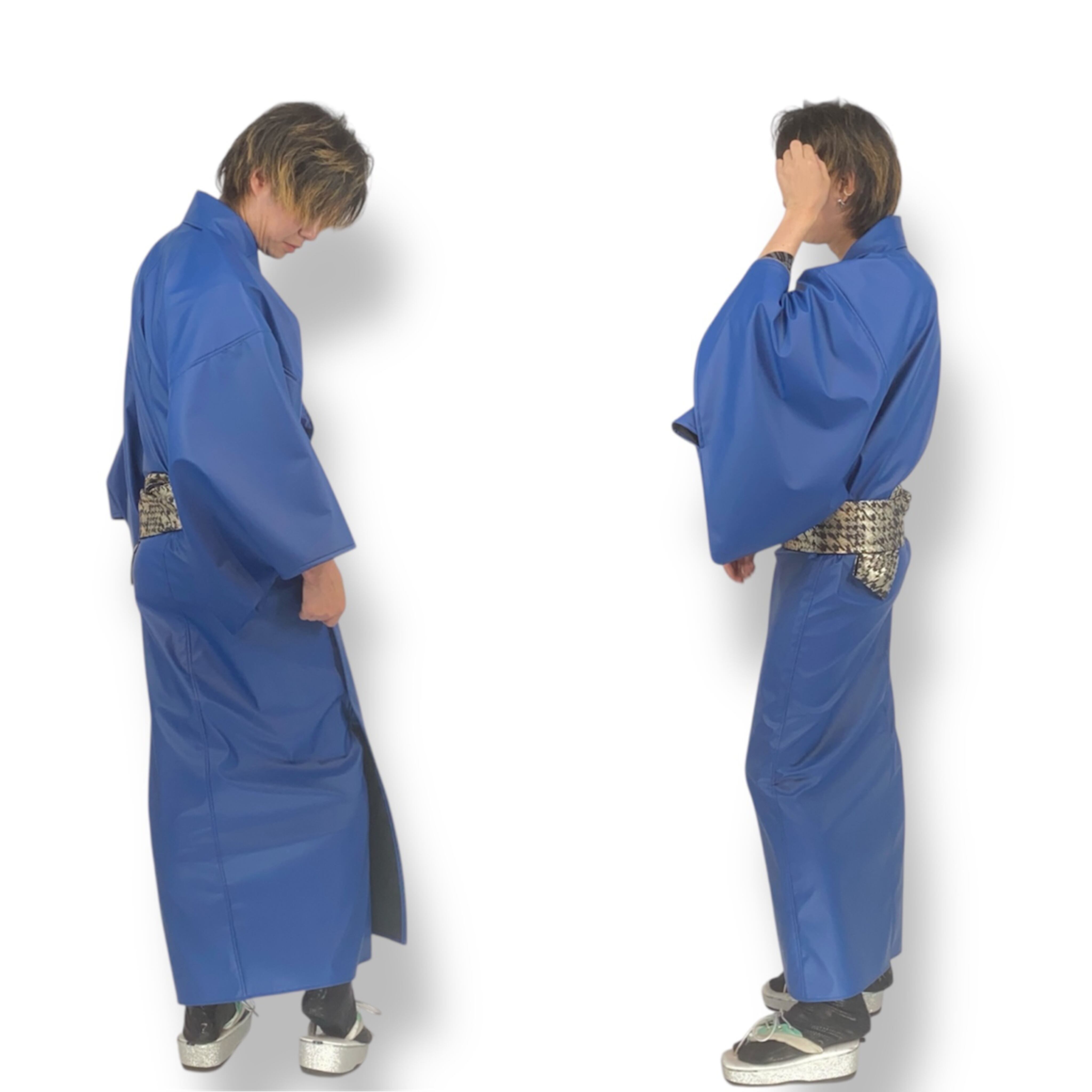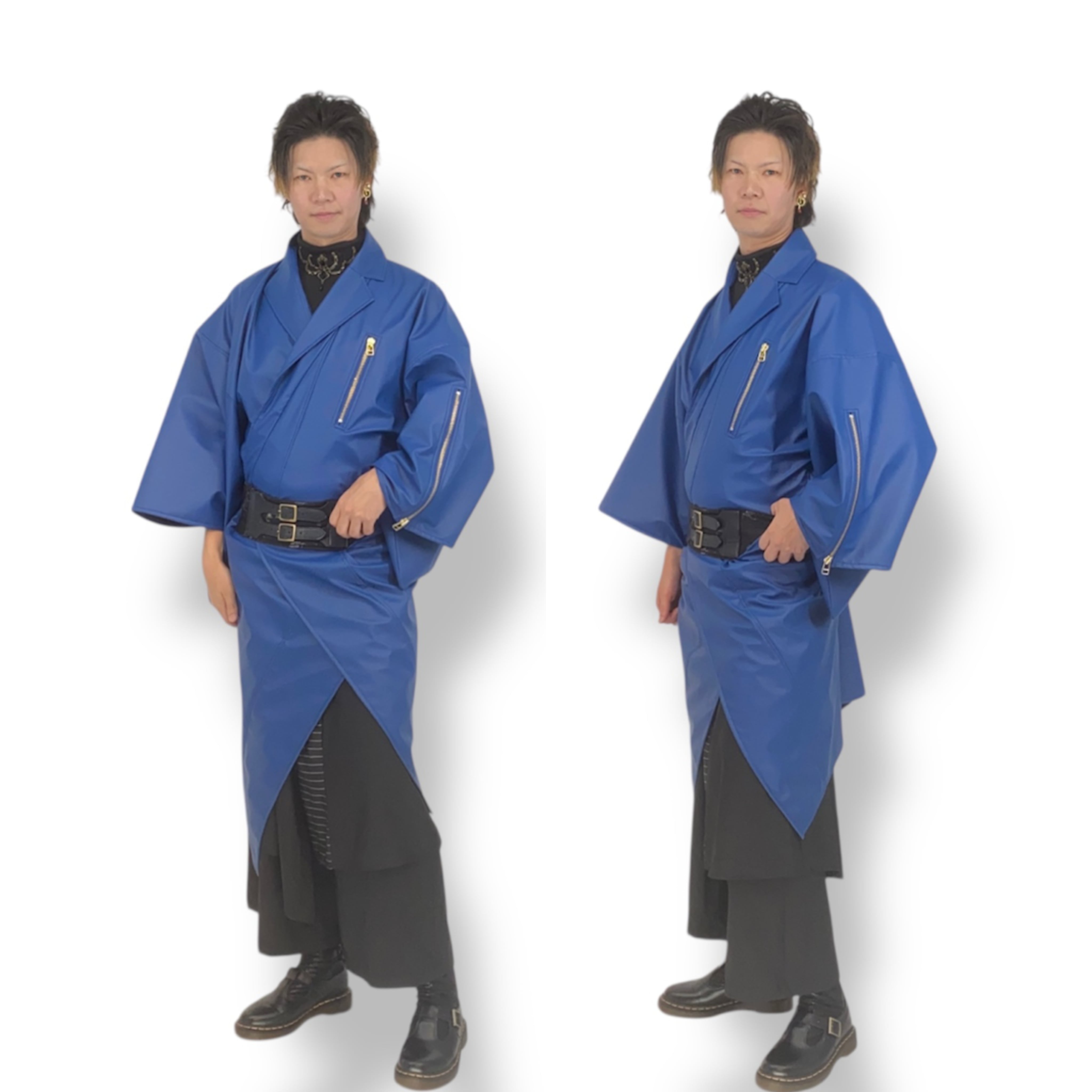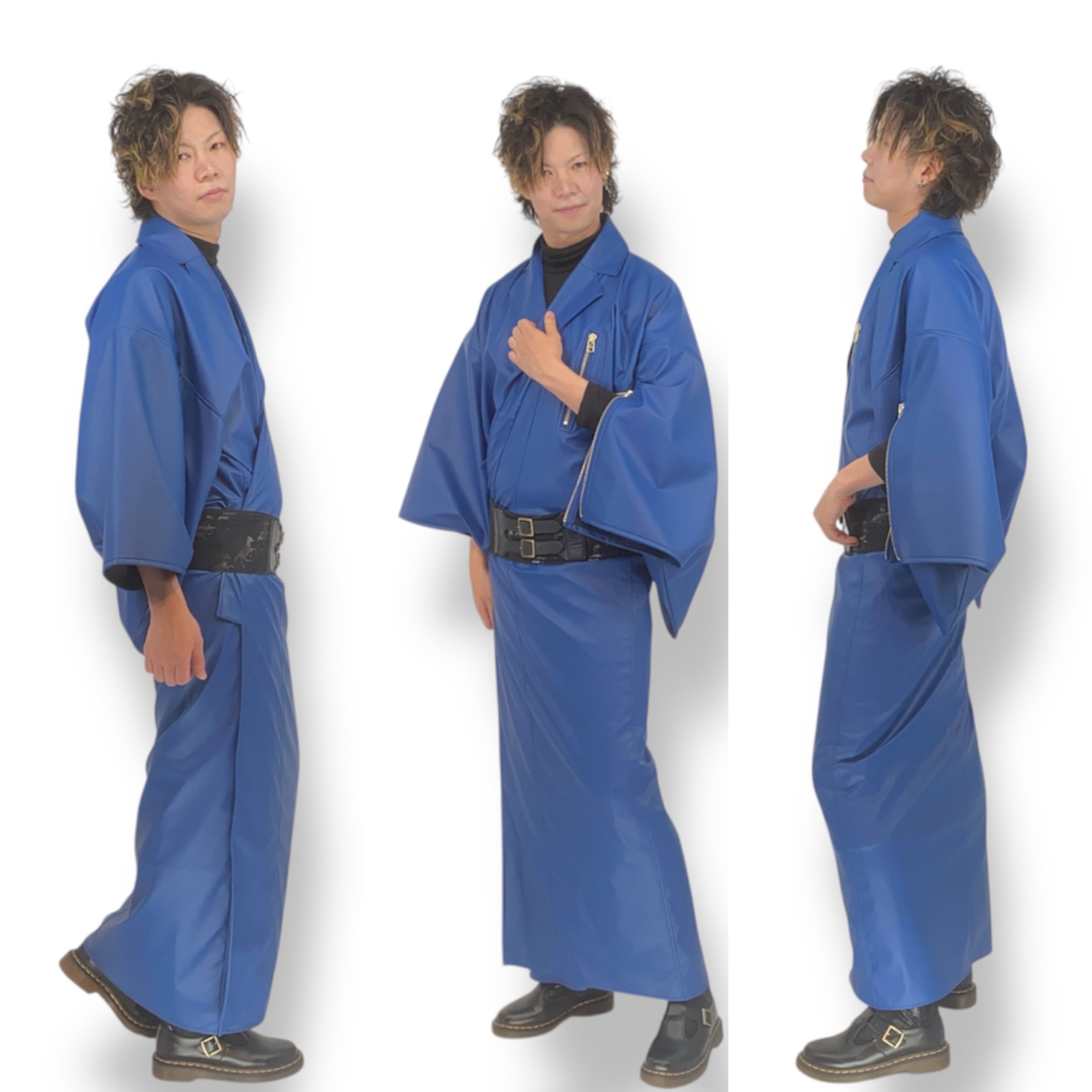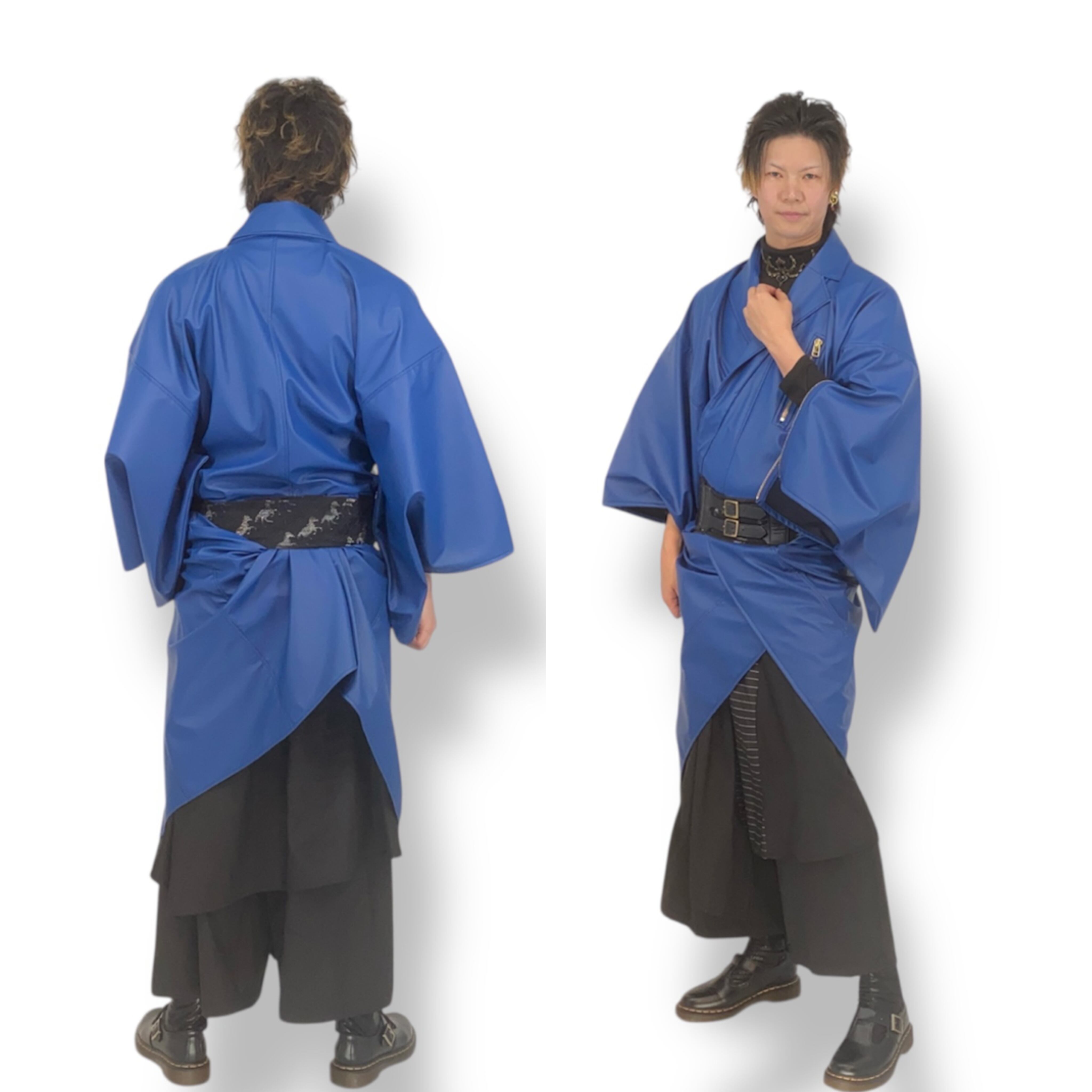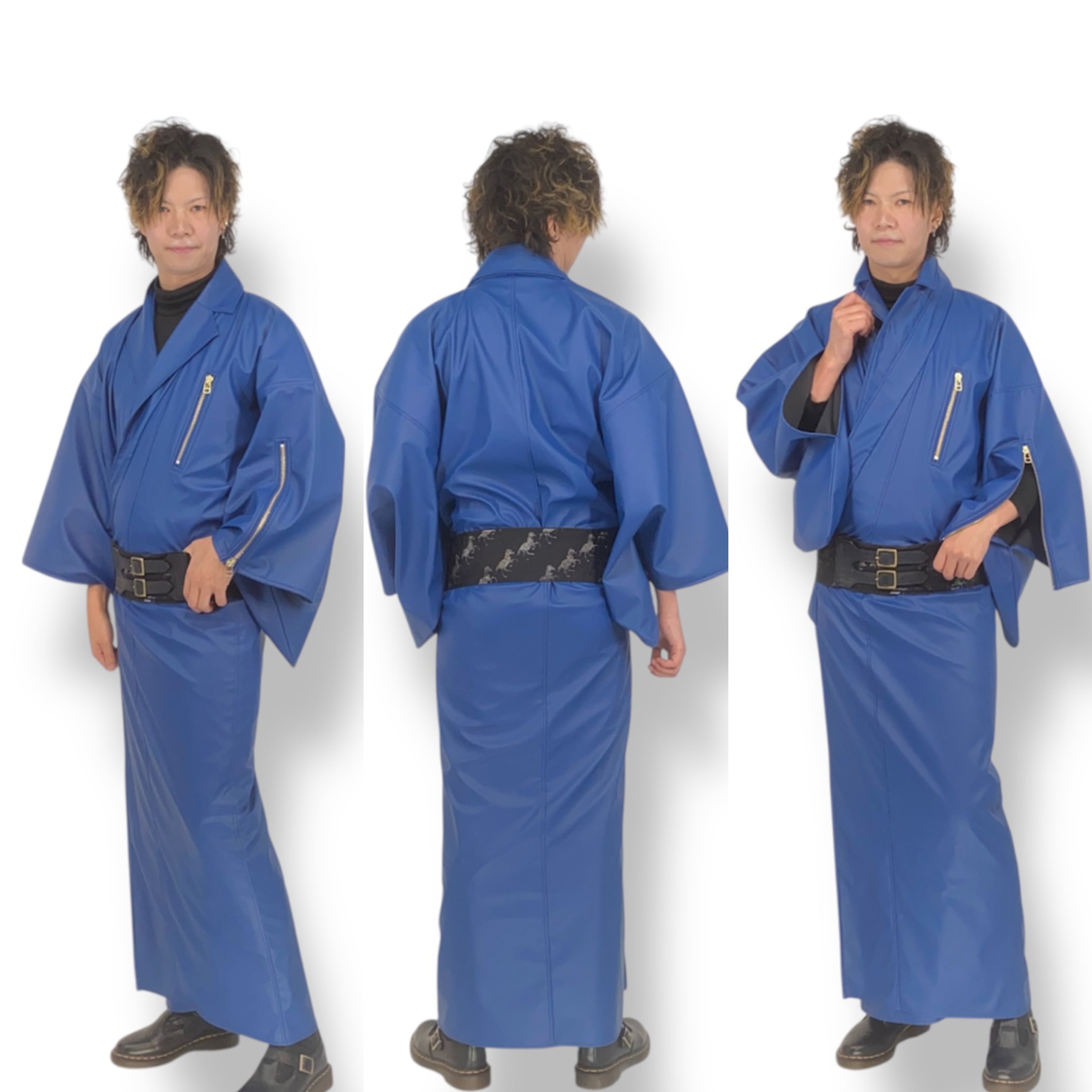 伸縮性もあり、風を通さないフェイクレザーキモノで本当に気楽にコーディネートを楽しんでいただけます。半巾でも兵児帯でも、名古屋帯でも袋帯でもベルトでも、、ロングジャケットを羽織る感覚で正解なんかない自分だけの着姿を作り上げて下さい。