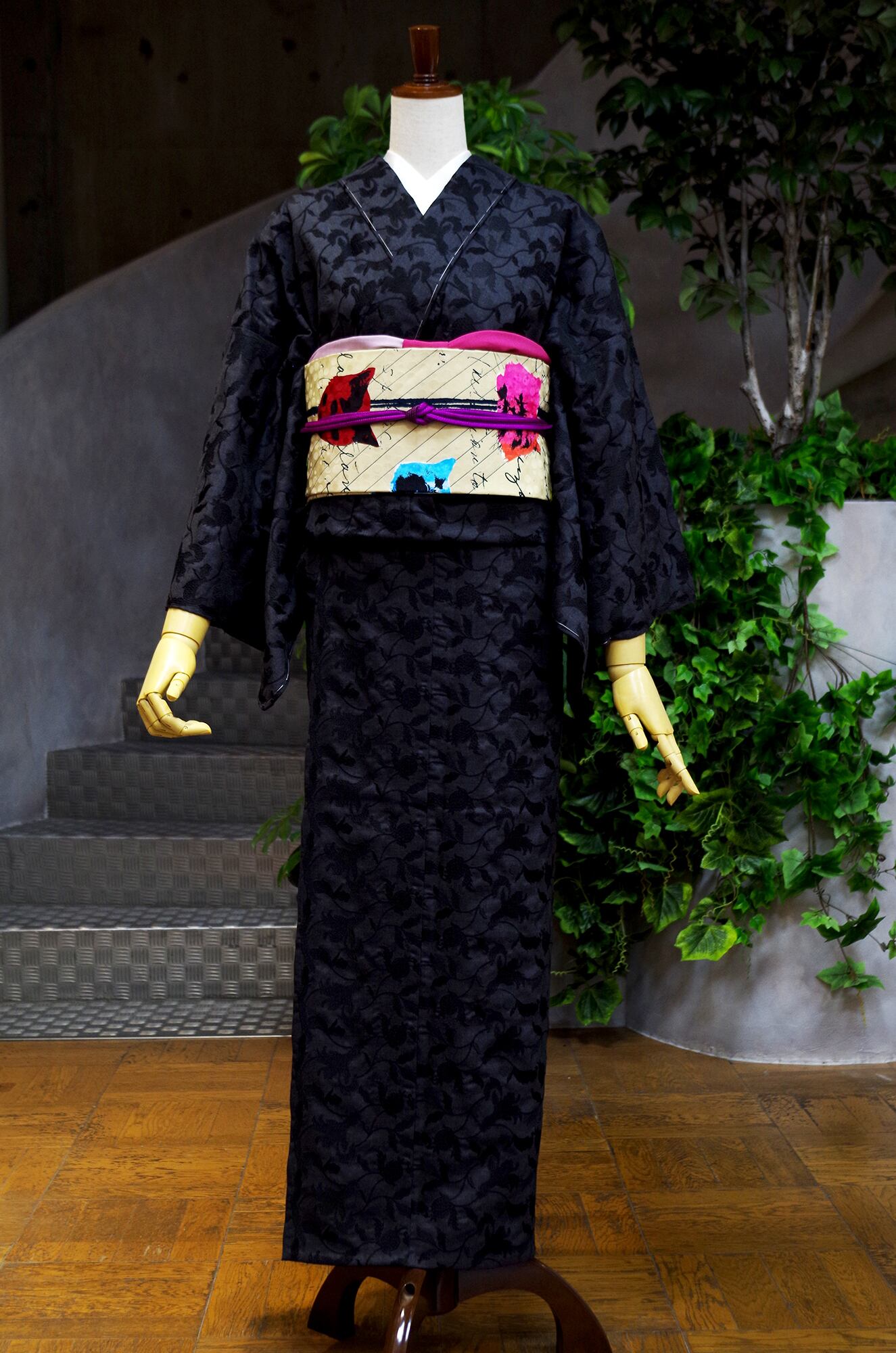 グラースオリジナル単衣着物 レトロフラワーレース チャコール