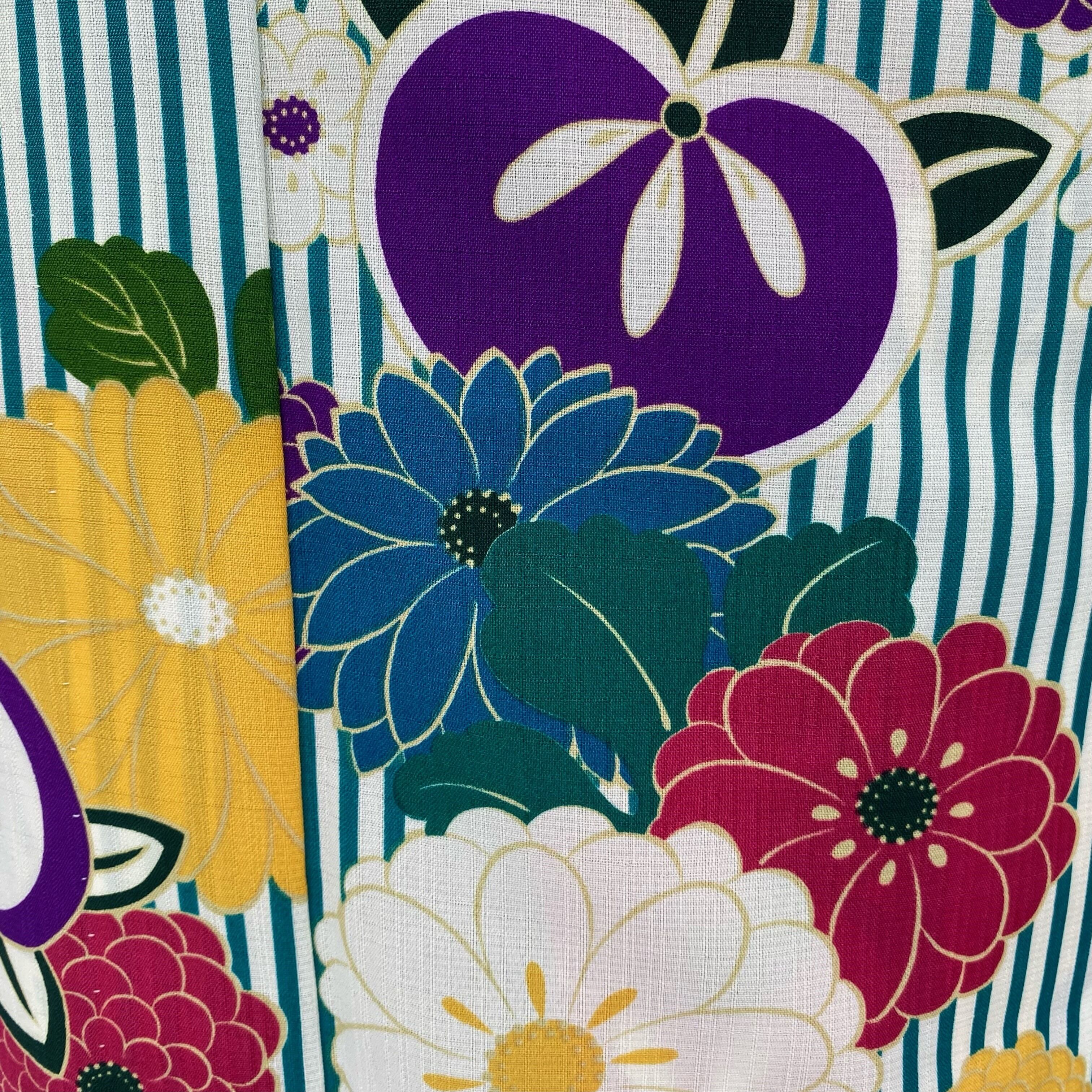 おしゃれでポップな和風館の浴衣。レトロに描かれたフラワーと全体に差し込むグリーンの縞がおしゃれさを演出してくれます。