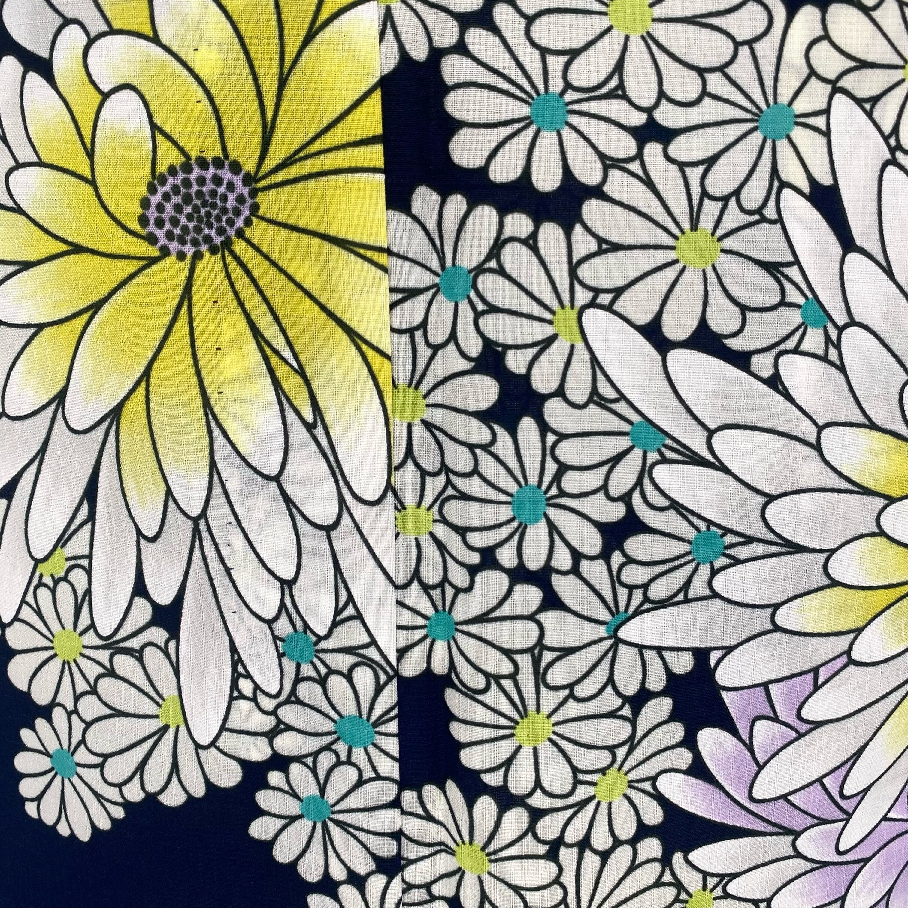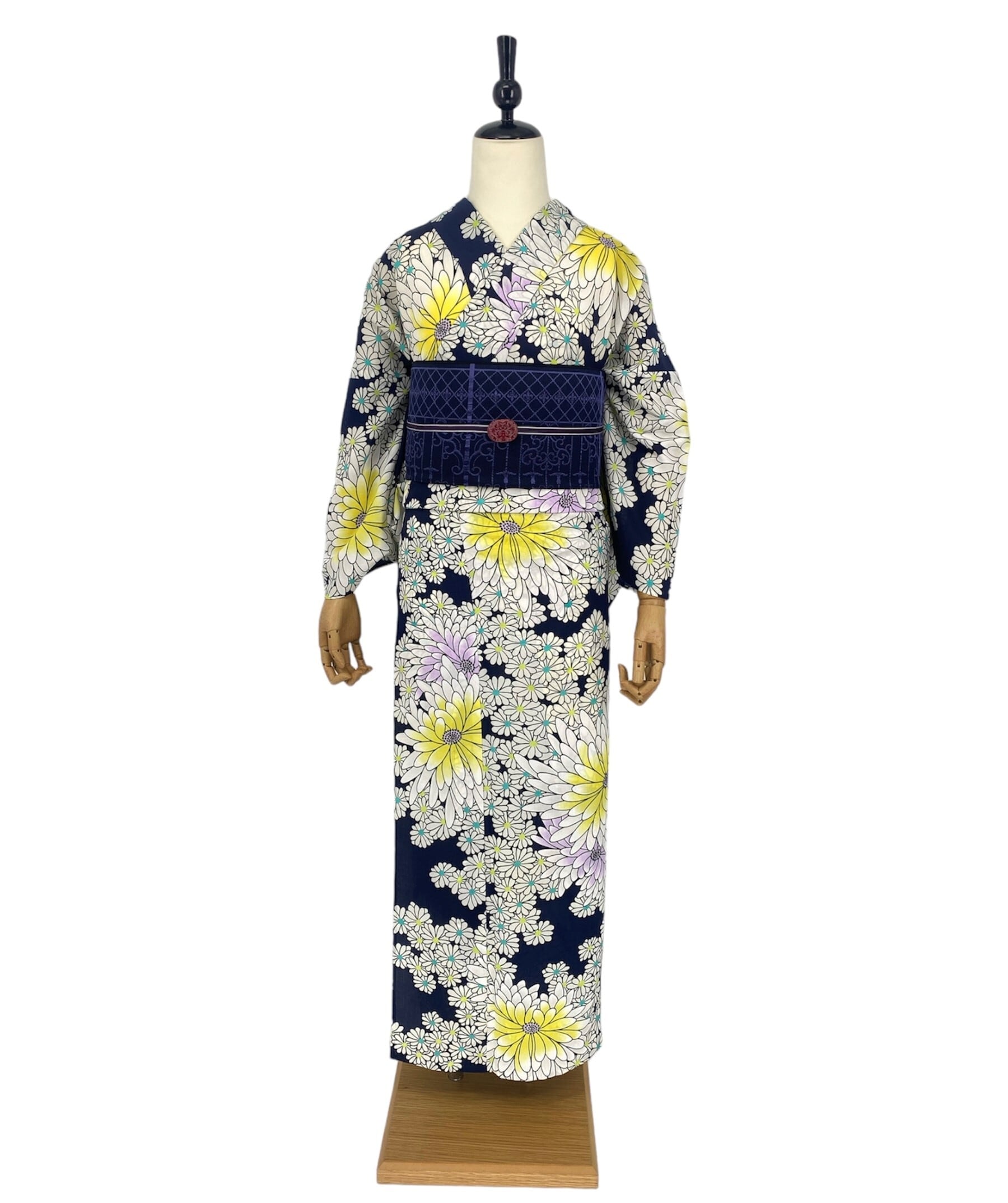 濃紺の生地に白ベースの華が描かれたきもの道楽の浴衣。重すぎない濃紺の字が大人っぽさを、白で色を抜き黄色と紫で染色された華がかわいらしさを。帯や小物の合わせ方で自分だけの着姿を作り上げる事が可能です。